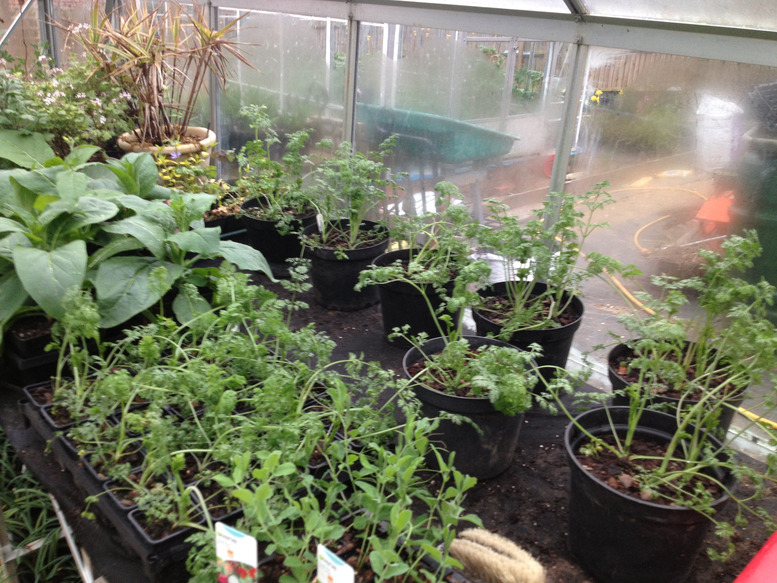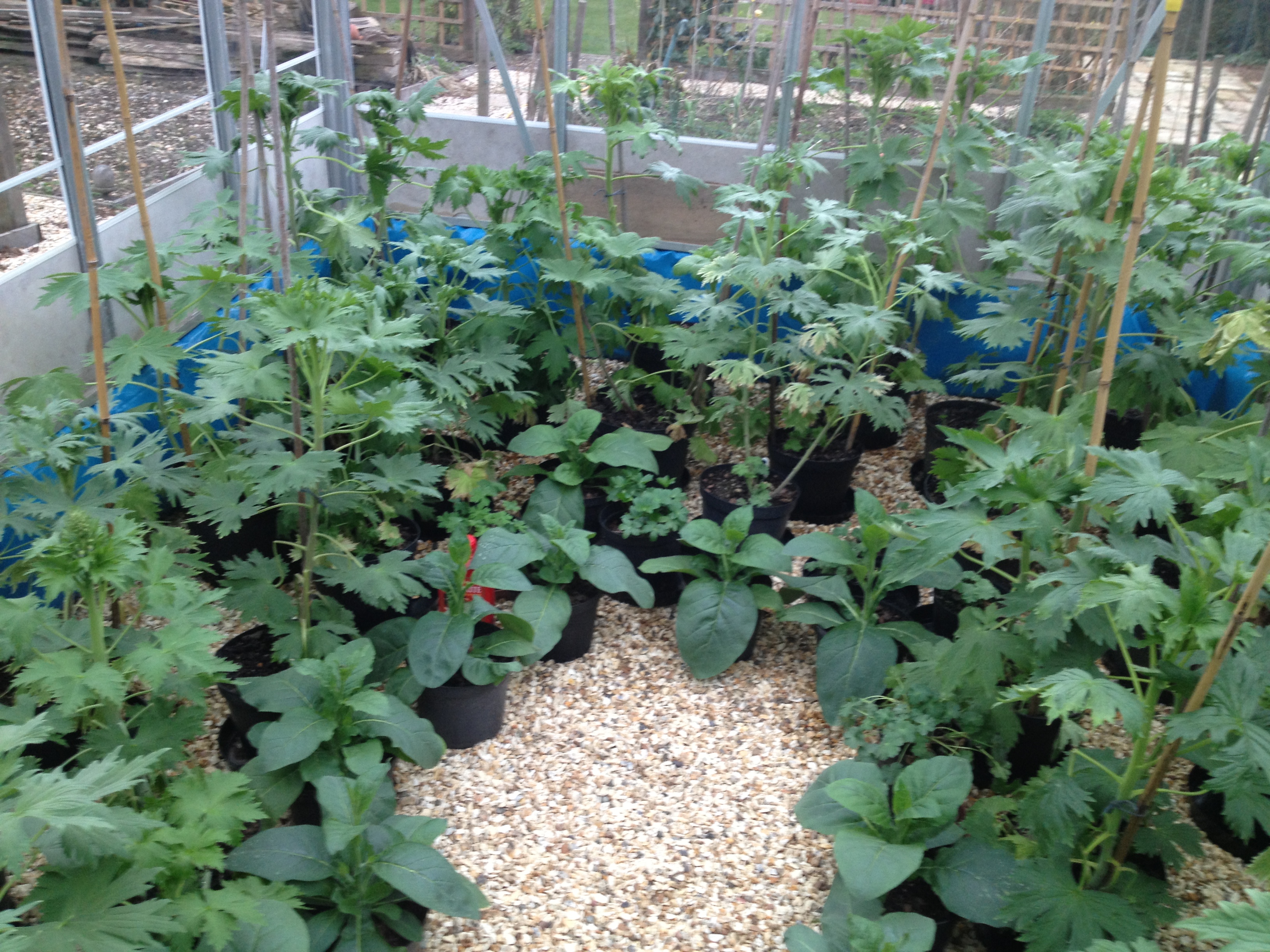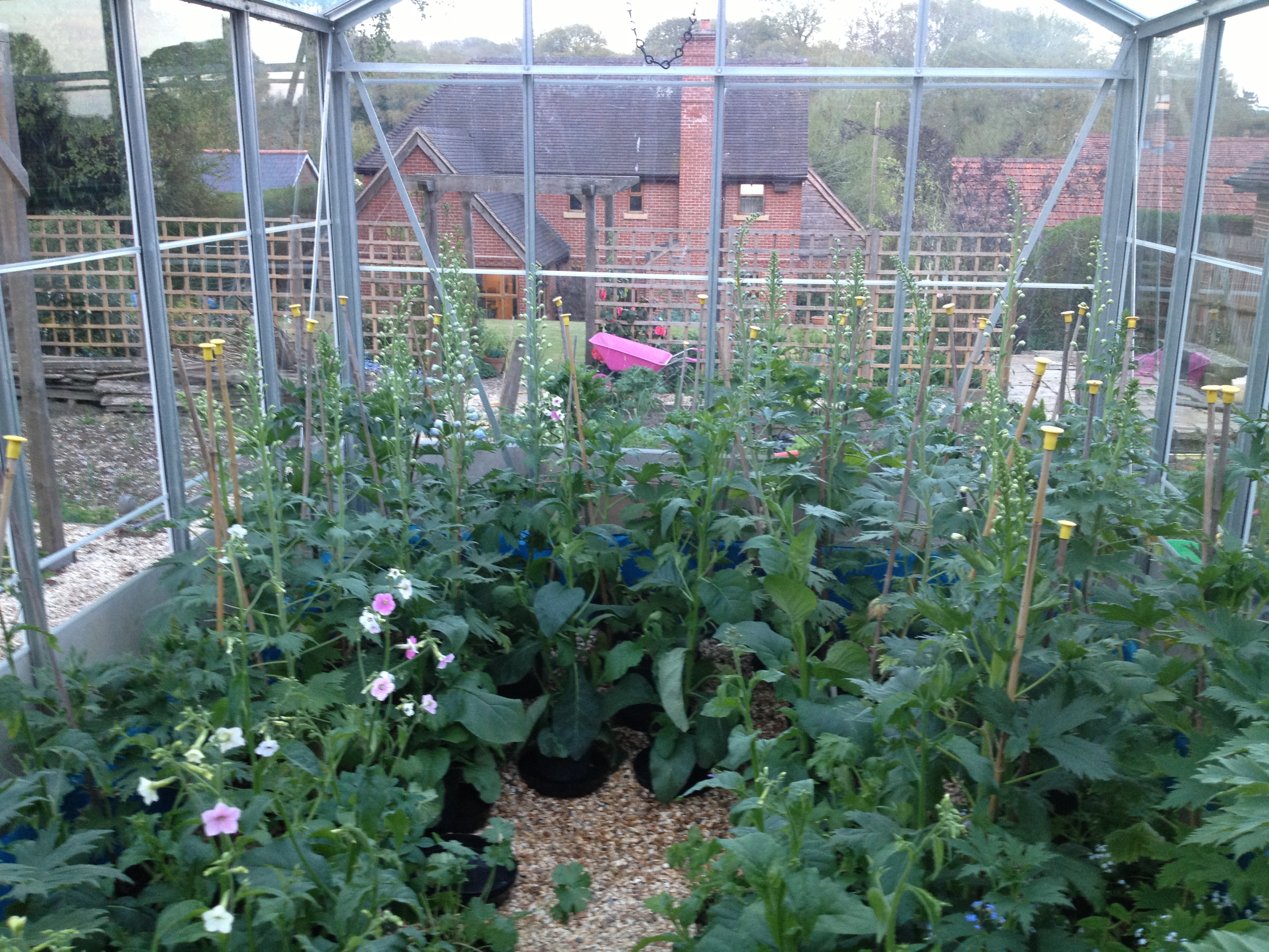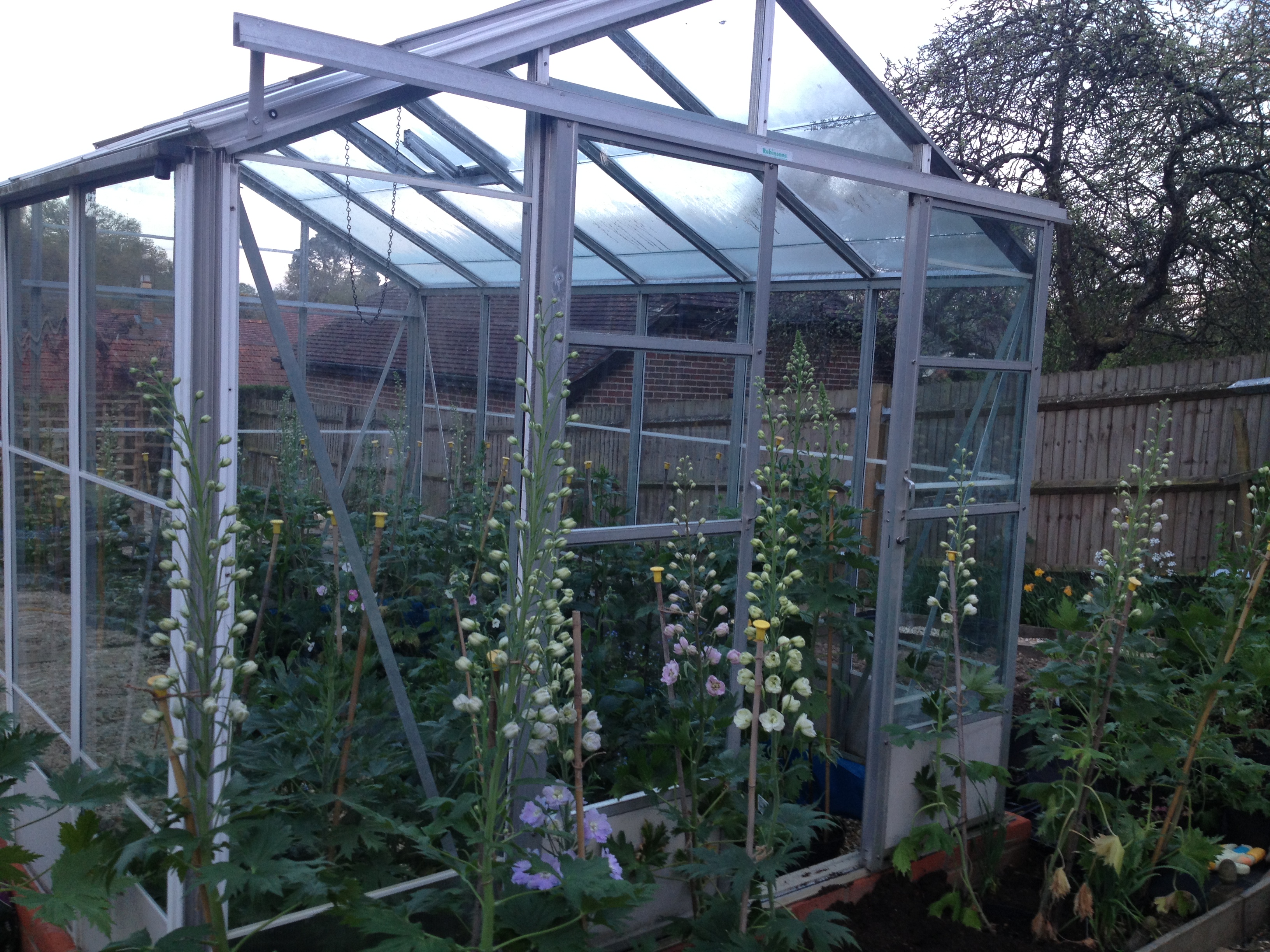 Since I don’t have the ability to do that, I’ve taken the plants out of the greenhouse and buried their pots up to the rim. Luckily the weather is going to cool down and be less bright – hopefully that will slow them some. There are of course gales and rain forecast…